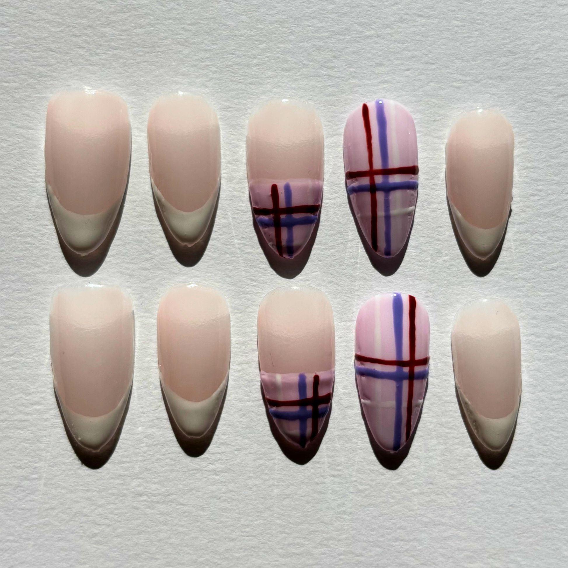 A soft nude press-on nail set featuring classic French tips with playful plaid accent nails. This design combines a blush-nude base, creamy white micro-French tips, and hand-painted pink, lilac, and burgundy striping for a cute, preppy look. Each set is handmade, durable, and fully customizable in your preferred shape, length, and size.