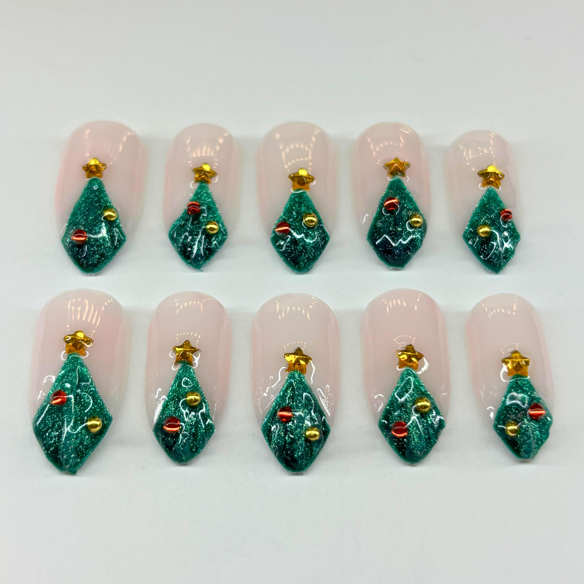 A festive Christmas press-on nail set featuring sculpted Christmas trees on a soft nude base. Each tree is hand-shaped in sparkly green, decorated with tiny red and gold “ornaments,” and topped with a gold star charm for the perfect holiday statement. These nails are glossy, eye-catching, and fully customizable in your preferred shape, length, and size.