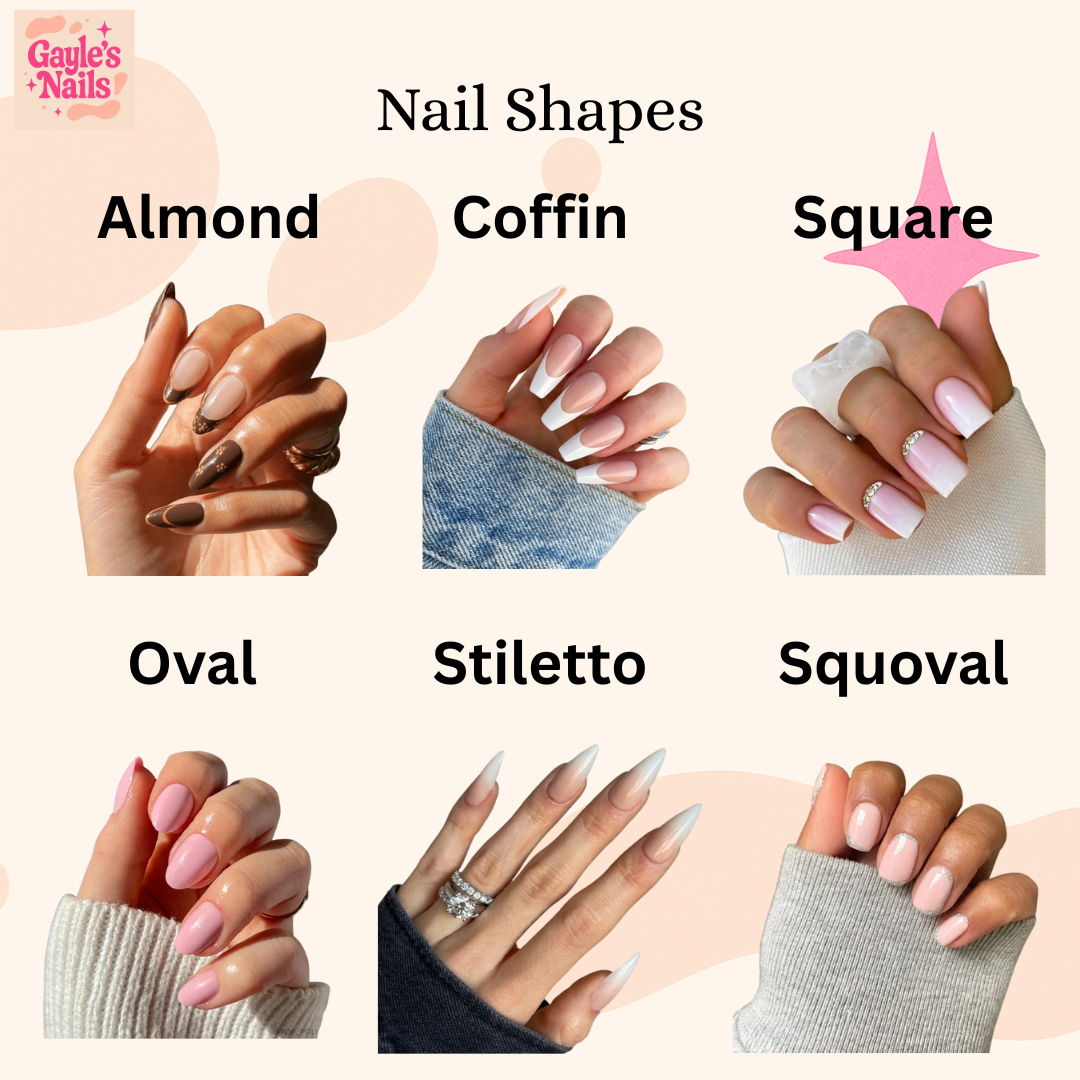 • Shape – Almond, Coffin, Square, Oval, Stiletto (options vary)